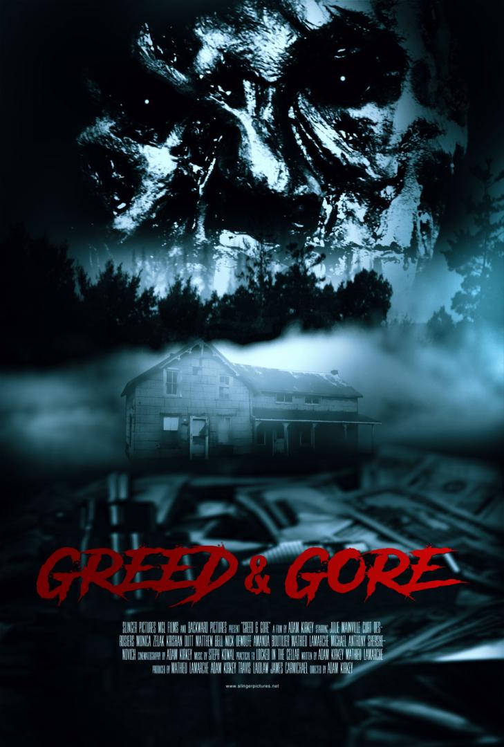 Synopsis expanded: After a bank robbery doesn't go exactly as planned, a crew of five pick a last minute safehouse to lay low with their take and a hostage. But the safehouse isn't so safe... Greed & Gore, a film by Adam Kirkey, is a mash of horror and thriller, with practical effects that will please all genre fans. It stars Julie Mainville (Butchers, The Good Doctor), Krishan Dutt (The Boys), Matthew Bell (Curse of the Anti-Quenched), Monica Zelak (Curse of the Anti-Quenched, Chronicles of Blood, The Enigma), and breakout stars Curt Derosier and Nick Dewolfe.